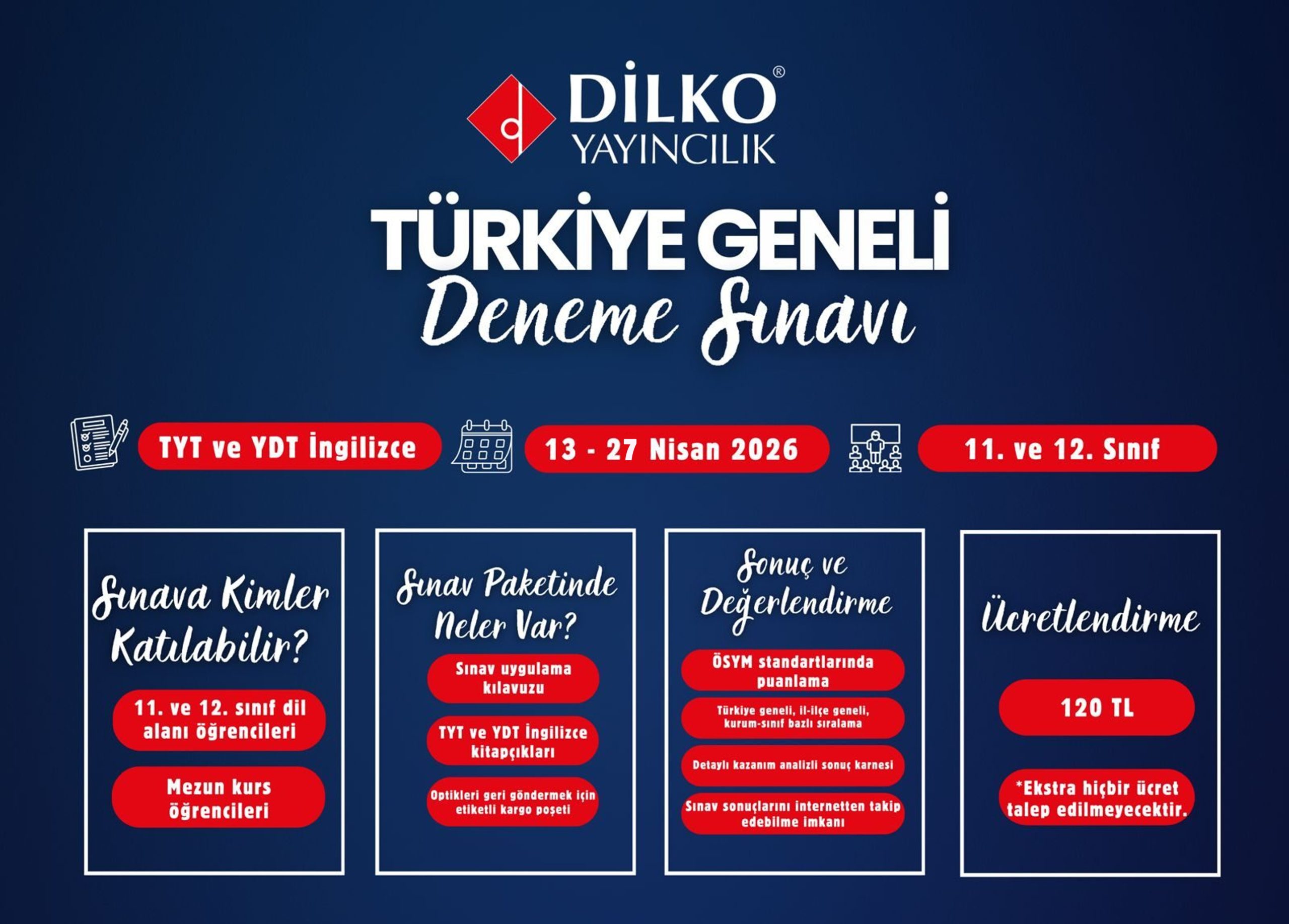 Türkiye’nin yabancı dil alanında lider yayınevi Dilko Yayıncılık’ın 13-27 Nisan arası gerçekleştirilecek 2026 Türkiye Geneli Deneme Sınavı’na hemen başvurmak için tıklayın.